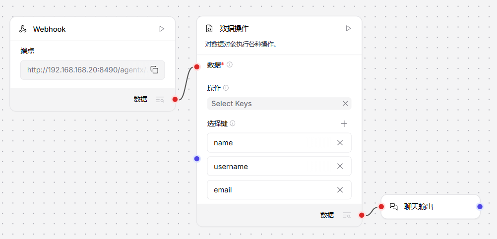 1、创建新工作流,添加Webhook组件和数据操作组件,将Webhook组件的输出连接至数据操作组件的“数据”端口