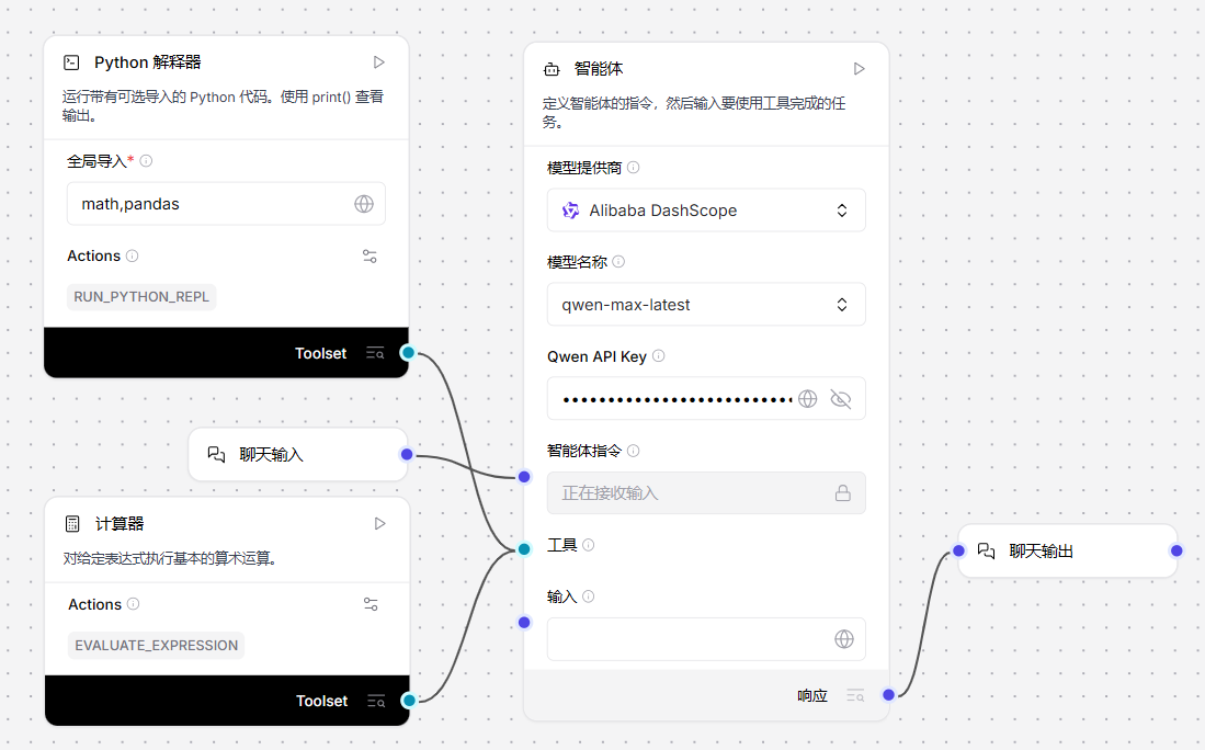 3、可选:在顶部菜单启用工具模式后,可将Python解释器组件作为工具连接至智能体组件。例如同时连接Python解释器和计算器组件作为智能体的工具,测试其如何选择不同工具解决数学问题