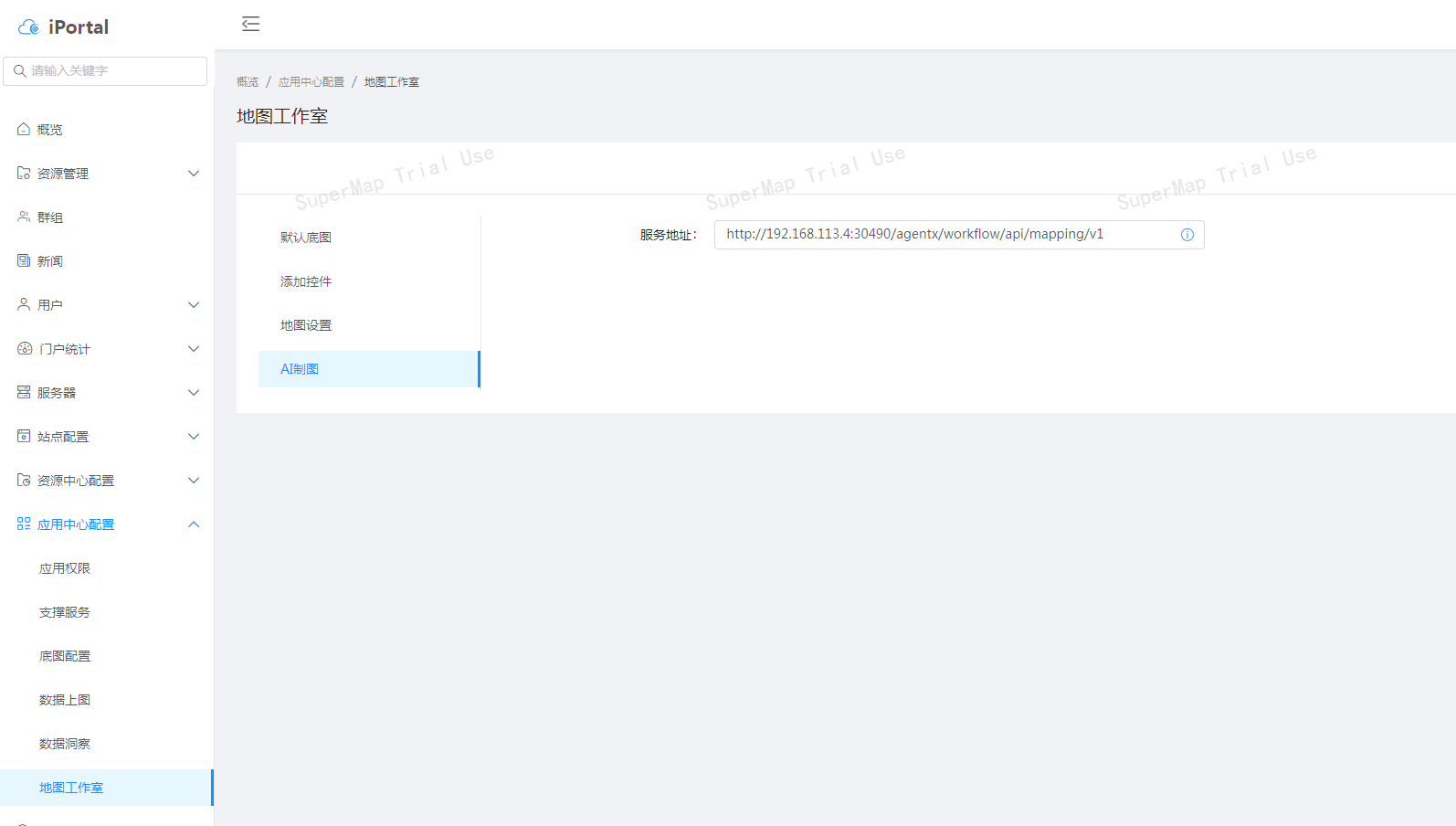 图:云套件iPortal GPA共享存储配置页面 (3)如需使用iPortal MapStudio AI制图功能,需要在云套件的iPortal中配置 AI 制图地址,服务地址填写为: