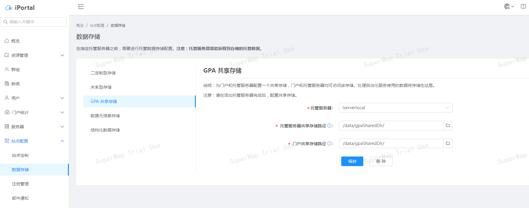 图:云套件处理自动化服务页面 (2)如需使用 AgentX 的 iPortal MCP 服务,需要在云套件的iPortal 中配置 GPA 共享存储,如下图所示: