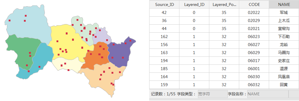 - 结果说明:根据上述的参数抽样出55个行政村为样本点,其中,Layered_ID为分层图层的ID,Layered_PopulationSize为样本点所在层所有的村庄总个数。样本点数据的空间和属性信息如下: