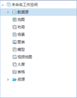 一个工作环境对应一个工作空间,每一个工作空间都由树状层次结构组成,该结构中工作空间对应根结点。一个工作空间包含唯一的数据源集合、唯一的地图集合、唯一的布局集合、唯一的场景集合和唯一的资源集合(符号库集合)等,对应着工作空间的子结点。