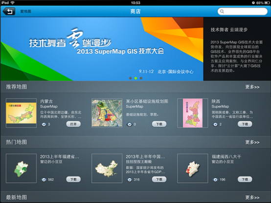按钮,打开iPad中内置的在线商店,可查看到共有云上的推荐地图、热门地图等数据列表,单击“更多”按钮,可查看该分类下的所有地图数据。点击想要下载地图右下角的