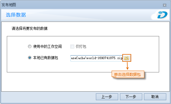 - 若在“选择数据”窗口处勾选了“本地已有数据包”单选框,选择的数据包需是通过“发布地图”中的“仅打包”功能打包出来的数据包。