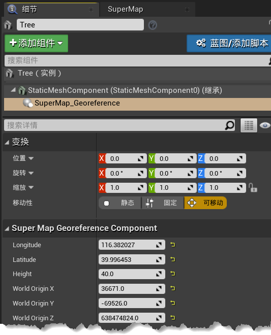 本页面提供SuperMap Georeference组件使用方法。基于SuperMap Georeference组件,可以将Unreal Engine对象移动到指定经纬度和指定高度处。
