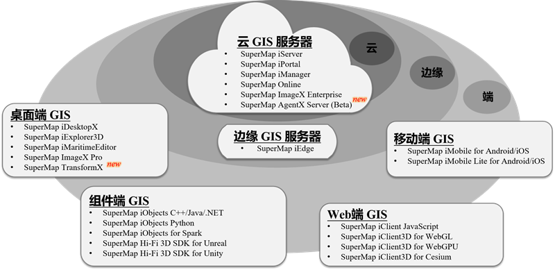 SuperMap GIS 2025 包含云 GIS 服务器、边缘 GIS 服务器、端 GIS 等多种软件产品,提供离线部署和在线服务 (SuperMap Online) 两种交付方式。