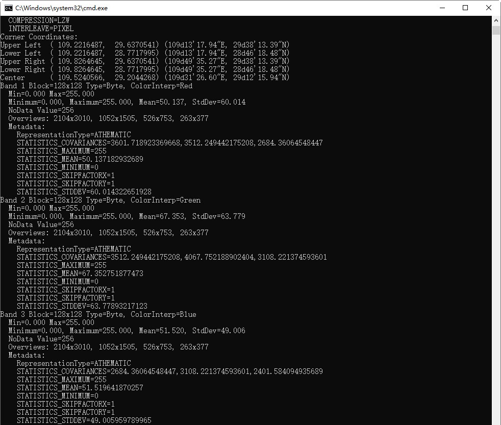 - Execute command: gdalinfo.exe [full path to image file], e.g.: gdalinfo.exe E:\data\raster.tif