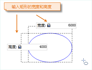 - 移动鼠标,可以看到蓝色的临时椭圆随着鼠标的移动大小发生变化。并且随着鼠标的移动,会实时地显示矩形的宽度和高度,在其后的参数输入框中输入参数值,按 Enter 键执行输入,确定椭圆的位置。
