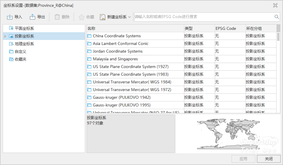 - 选择相关投影坐标系文件后,单击应用按钮即将选择的投影坐标系应用于当前选中的数据源、数据集或地图。
