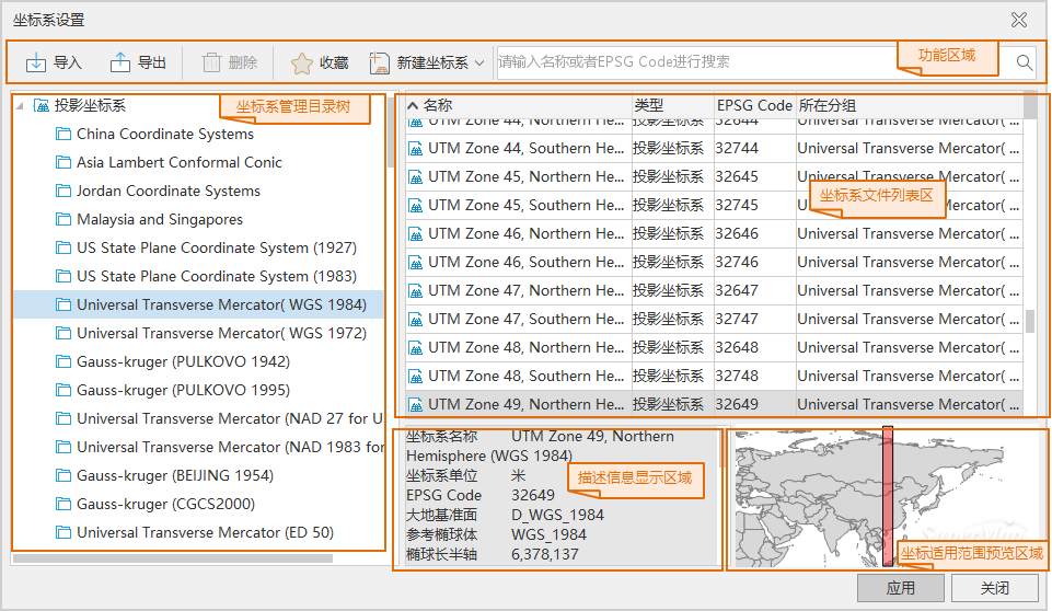 坐标系设置对话框用于自定义、设置以及管理当前工作空间中数据源、数据集或地图的坐标投影信息,其结构大致分为:功能区域、坐标系管理目录树、坐标系文件列表、描述信息显示区域、坐标适用范围预览区域。