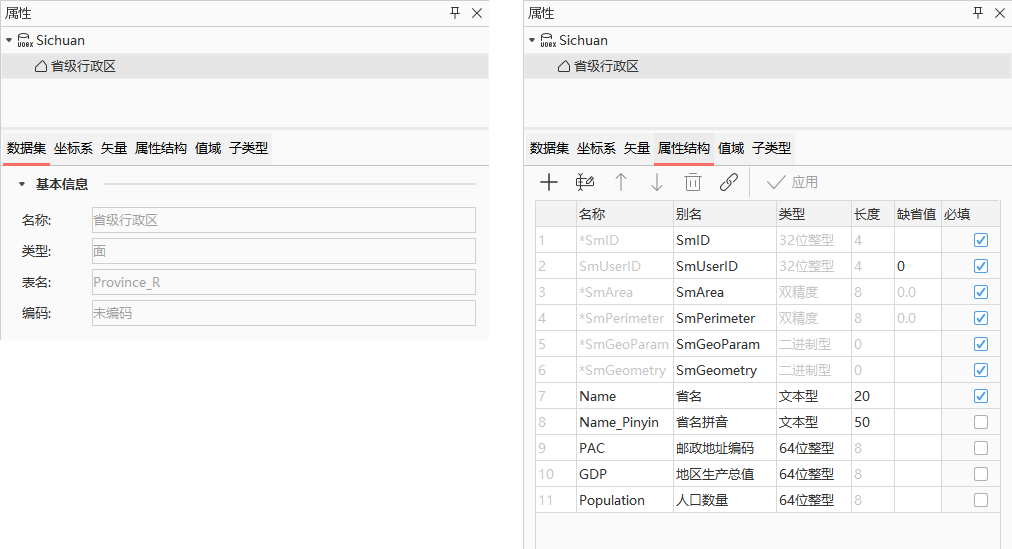 以省级行政区为例,通过数据集属性查看属性结构信息,结果如下图: