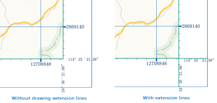 - Extent Corner Lines : This checkbox controls whether to extend the border line of a grid to the map frame (inner frame for complex frames). iDesktop will display corner extension lines and corner labels without overlapping each other by default when you add them together.