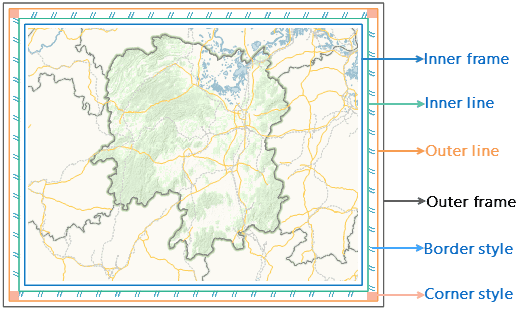 - Inner Frame/ Outer Frame/ Inner Line/ Outer Line: You can set the line symbol, line width, line color and distance for each of the four. The line or frame will not be displayed if you set the line width of it to 0. Distance specifies how far awasy the current frame or line is from the inner frame or line. The Distance parameter for inner frame sets the distance between the frame and the inner map.