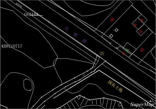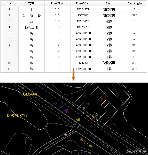 自定义标签,用来实现同一个专题图层中,不同类型的标签在字体、大小、旋转角度、颜色上的多样性展示。例如CAD数据导入后,对其中包含有文本信息的点数据制作自定义标签专题图,就可以达到与CAD中相同的文字显示效果。如下图所示,为对导入的CAD文件中的点数据制作自定义标签的显示效果。 注意:点、线、面数据集均支持制作自定义标签,但线数据集的自定义标签不支持沿线标注,通过指定字段的方式控制标签的字体、文字大小、文字旋转角度、文字颜色、标签偏移量,只对点标签专题图有效。
