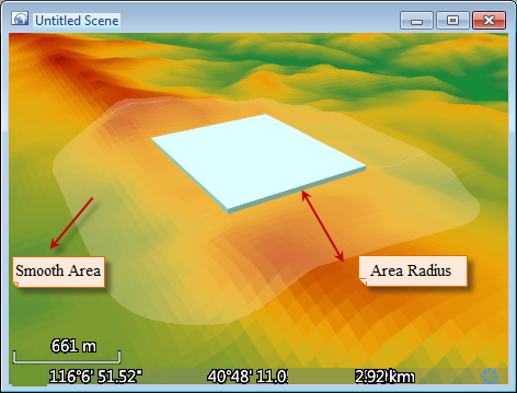 - Smooth Coefficient: It is the key to influence the buffer effects of transition region and is similar to the power of a power function. The effects is better when the value is in [0,3]. It not only keeps the original landform features but also conducts smooth in a certain degree, which transits the model and terrain naturally. When the value is 0, represent no smooth to the transition region of model.