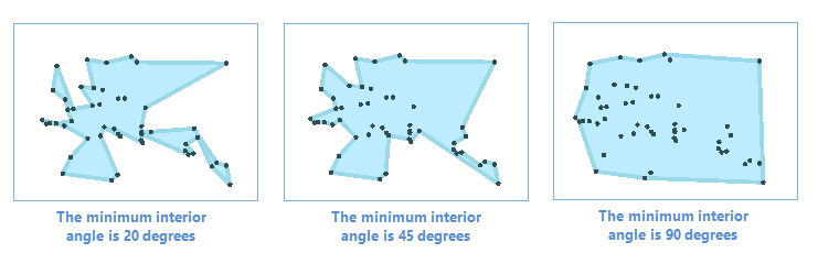 - supports specifying a point set or a point dataset and the minimum interior angle to calculate a concave polygon. The minimum angle have an effect to the area of the result polygon. In general, the smaller the angle, the smaller the area. Not the angle of setting is as small as possible, you need to set it reasonably.