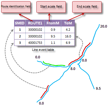 Line event describes a segment along a route, such as the pavement of a road, the traffic condition of a street or the pipe diameter of a pipeline, etc. As shown below, in a line event table, each line event must contain a route ID, and use from m-value and to m-value to store its location.