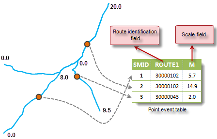 Point event is an accurate point that happened in a route, such as an accident point on the road, a chronograph on the freeway, a valve on pipeline, etc. In a point event table, each point event has a corresponding route ID, and a measure field describing the location of the point event.