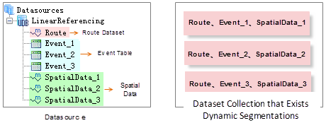 Spatial data and event tables are in one-to-many relationship, and route dataset and spatial data are in one-to-many relationship, and an event table and spatial data are in one-to-one relationship. In the figure on the left below: The datasource LinearReferencing, Route is a route dataset, SpatialData_1, SpatialData_2 and SpatialData_3 are the spatial data created by Route and event tables Event_1, Event_2 and Event_3 respectively. There are three dynamic segmentation relations in the datasource, as shown in the figure on the right.