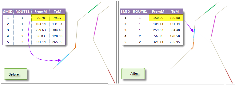 Changing the route position of events means changing the m-value filed of the event table or spatial data. When changing a m-value in the event table, the geometric and attribute information of the corresponding line/point object will be changed at the same time; when changing the m-value of the spatial data, the corresponding geometry will be changed at the same time, so was the m-value of the corresponding event in the event table. For line event, change the from-measure or to-measure may change the length and location of the event. In the figure below, the measure values of the first event is (20.78,79.37), when changed to (150.00,180.00), the spatial data is changed at the same time.