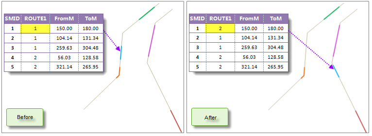 - When changing the route ID of an event, the geometry and attribute information in the spatial data will be changed at the automatically. In the figure below, when changing the route ID of the first event, the spatial data is changed at the same time.