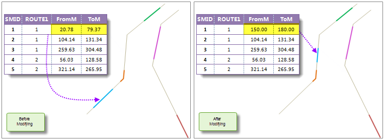Changing the route position of events means changing the measure value of event table or spatial data. When changing a m-value in the event table, the geometric and attribute information of the corresponding line/point object will be changed at the same time; when changing the m-value of the spatial data, the corresponding geometry will be changed at the same time, so was the m-value of the corresponding event in the event table.