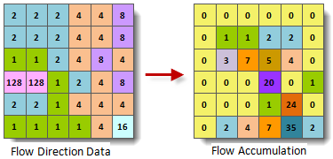 - The result shows the total accumulation for every cell. Each value is determined by all upstream cells except current cell itself.