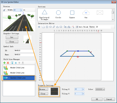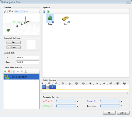 3D line symbols can be created in the 3D Line Symbol Editor. A 3D line symbol is composed of a number of child lines. A desirable 3D line symbol can be created through creating child lines of different forms and styles. Therefore the basic element of a 3D line symbol is a child line. There are two types of child lines: section child lines and model child lines.