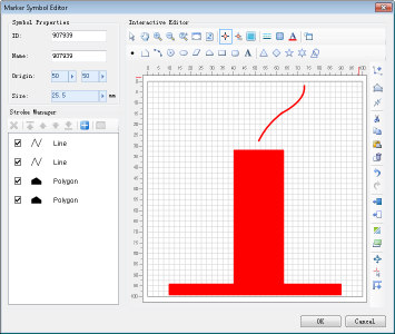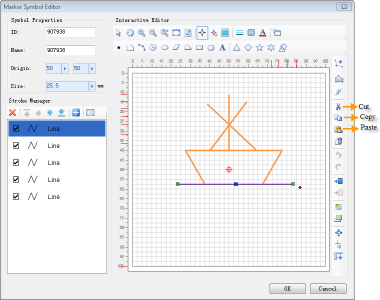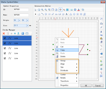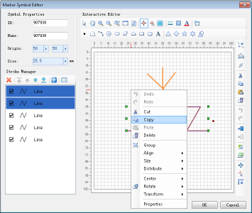 This section introduces simple functions provided in the Marker Symbol Editor to edit strokes of marker symbols. The functions include: deleting strokes, copying and pasting strokes, undoing and redoing editing, editing stroke nodes, arranging (aligning) strokes, rotating strokes, and transforming (mirroring and inverting) strokes. The usages of these functions are described in details below.