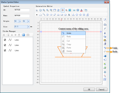 The Undo and Redo buttons in the toolbar as well as the Undo and Redo options in the editing area can undo and redo editing operations performed on the symbol.