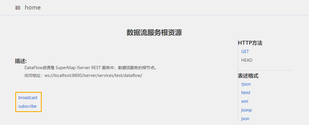 - 数据流服务根资源:页面记录了数据流的访问地址,以及 broadcast (发送)和 subscribe (接收)两个跳转链接。