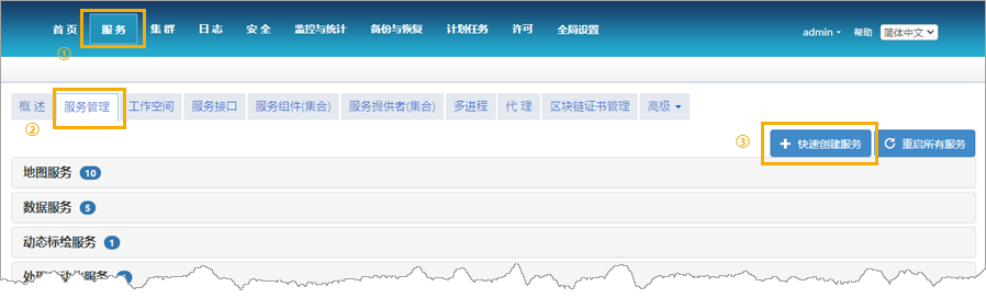 - 新建数据流服务:点击 服务管理 -> 服务 -> 服务管理,进入服务管理页面,点击快速创建服务。具体步骤如下: