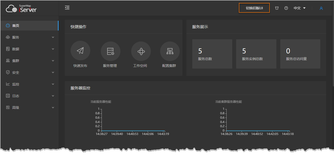 注意:以上图片使用的是iServer的旧版本页面,如下图,可点击切换旧版本IU按钮进入iServer的旧版本页面。