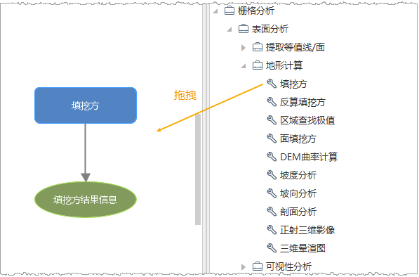 - 添加工具:在工具箱中选中工具,直接拖拽到画布中即可,可以依次拖拽添加工作流程中需要的工具到画布中。模型中添加的工具可以是常规的工具,也可以是通过Python定制的工具。