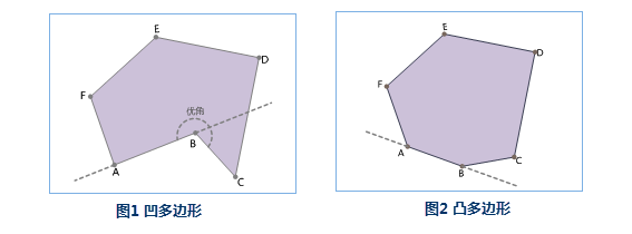 凹多边形,是指一个多边形的所有边中,有一条边向两方无限延长成为一直线时,其他各边不都在此直线的同旁,那么这个多边形就叫做凹多边形,其内角中至少有一个优角(即大于180°而小于周角360°的角)。如下图1所示的凹多边形,其中∠ABC 为优角;延长 AB 线,该多边形其他各边不都在 AB 延长线的同旁。与凹多边形对应的另一类多边形为凸多边形,是指一个多边形的所有边中,任意一条边向两方无限延长成为一直线时,其他各边都在此直线的同旁,那么这个多边形就叫做凸多边形,其所有内角小于等于180度,任意两个顶点间的线段位于多边形的内部或边上,如下图2。
