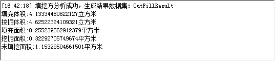 执行完毕后会在输出窗口显示填挖方计算结果,包括填充体积、挖掘体积、填充面积、挖掘面积、未填挖面积5项内容,其中体积单位为立方米、面积单位为平方米。如下图所示: