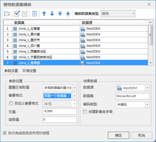选取中国12个省的 DEM 栅格数据,文件大小为4.42G;分别使用栅格拼接、栅格追加和栅格镶嵌三种方式将12个栅格数据合并为一个栅格数据集。