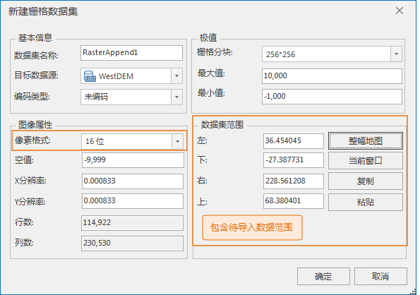 - 数据集范围:追加导入的所有栅格数据的最大范围,单位与导入数据坐标系的单位相同。例如用户将导入整个四川省的多幅栅格数据,即可将省界范围作为数据集的范围。