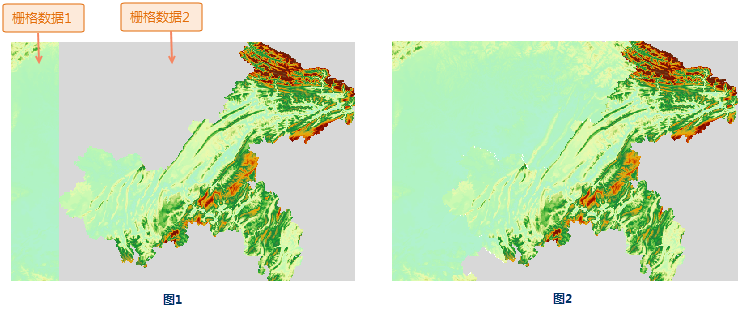 - 栅格拼接、栅格追加导入处理重叠区域方式相同,当数据之间存在重叠区域时,默认为后一个数据覆盖前一个数据,故用户在导入数据时,需要根据数据实际情况调整数据导入顺序,避免有效区域被无值区域压盖。如下图所示,栅格数据1和栅格数据2拼接,栅格数据2边界处有存在无值区域(灰色区域),当栅格数据集2为后导入数据,则结果如图1所示,拼接后的栅格1中的有效区域被栅格2的无值区域覆盖;若将栅格1作为后导入数据,则结果如图2所示。