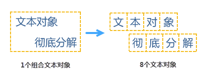 - 简单分解:将复合文本对象分解为多个子对象文本字符串,如下左图为两个子对象组合成的复合文本,简单拆分后,则变成了右图的两个文本对象。