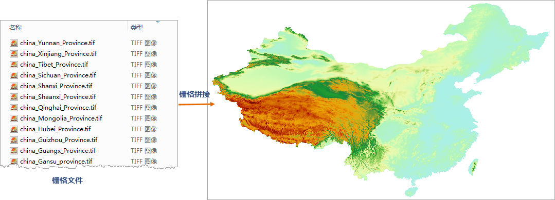 现有全国34个省级行政区域的DEM栅格数据文件,数据文件的坐标系、像素格式等信息相同,通过栅格拼接功能快速拼接得到如下图所示结果: