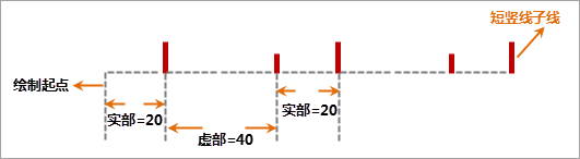”子线类型,称为短竖线类型的子线,如下图所示,如果设置虚实模式为:实部值为20,虚部值为40,设置完成后,短竖线类型的子线将按照如下模式进行绘制: