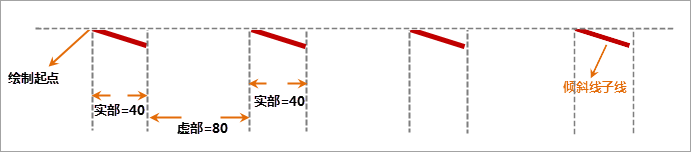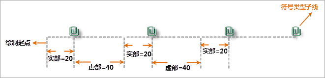 - 接下来,在距离上一步所绘制的符号元素开始 40 长度(虚部=40)范围内部不进行任何内容的绘制,即空白部分为所设置的虚部 80;