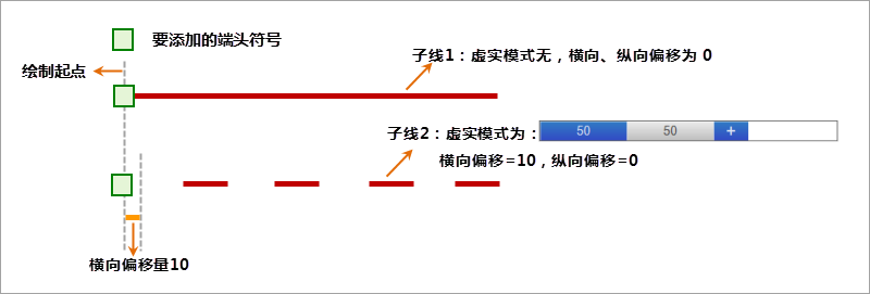 如下图所示,制作某个线型符号,其由两个子线构成:子线1和子线2,两个子线都为短横线类型,根据所制作的线型符号的要求,对子线进行适当的横向偏移和纵向偏移,并设置子线的颜色风格和线宽,即可完成该线型符号的制作。线型符号编辑器中提供了类型多样的子线,用户可以基于这些子线,通过修改子线的风格和样式,构建所需要的线型符号。