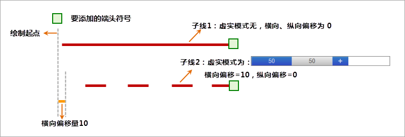 在线型符号编辑器中制作线型符号,线型符号都是由若干子线构成,通过子线的不同形式和风格样式来构建所需要的线型符号,因此,构成线型符号的基本元素是子线。例如,下图所示,展示了子线构成线型的基本方式。