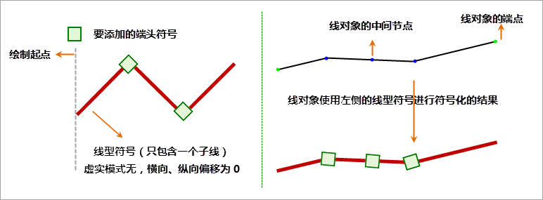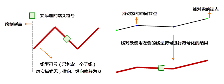 - 自定义符号(相对角度):如果对构成子线的符号设置了符号的旋转角度,那么子线中所有的符号的旋转角度可能不统一,例如,在符号化线对象时,如果线对象为折线,符号的旋转角度的0度起算点会随折线中每一个线段的不同方向而发生变化,此时,垂直于线段的正方向为角度的0度起算点,逆时针为角度值增大的方向;在符号化线对象时,如果线对象为曲线,此时,垂直于曲线切线的正方向为角度的0度起算点,逆时针为角度值增大的方向。