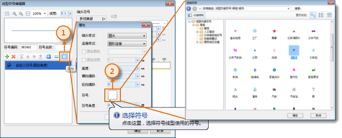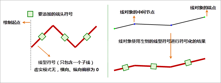 此外,子线还可以由特定的符号构成,如下图所示,子线的类型为符号子线,即由符号构成的子线,通过子线的虚实模式(有关子线的虚实模式,参见下文虚实模式内容)可以调整子线中的符号如何分布,如符号间的间隔等。设置子线的类型为符号子线,需要选择子线类型列表中的“自定义符号”,如上面(右图)所示。