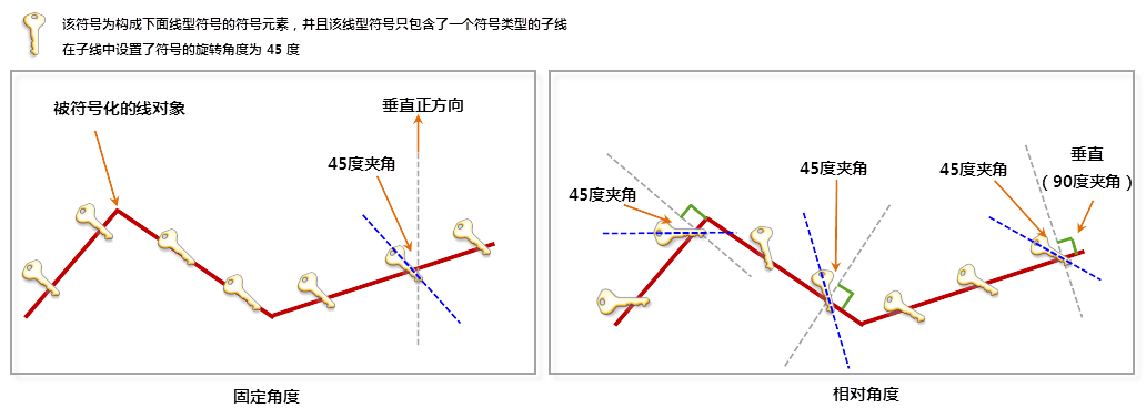 - 自定义符号(固定角度):如果对构成子线的符号设置了符号的旋转角度,那么子线中所有的符号的旋转角度始终一致,都以垂直正方向为角度的0度起算点,逆时针为角度值增大的方向,并且,在符号化线对象时,不论线对象是直线还是折线,该子线中的符号始终保持一致的方向。