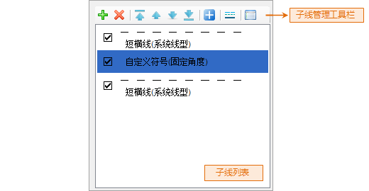 在子线管理区域中,子线列表中的子线的排列顺序,即为线型符号中相应的子线的上下叠加顺序,子线列表中处于最顶端的子线在线型符号中也处于最顶层;子线列表中处于最底端的子线在线型符号中也处于最底层。通过子线管理工具栏上的“