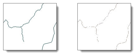 栅格中的线段由一串彼此相连的像元表示,各个像元的值相同,但与邻域的值差异较大,如下图所示。值得注意的是,对角的像元也是相连的像元,所以一个像元上下左右以及对角上只有一个相连像元时,标识要素的断开,该像元是线段的一端。当矢量线转化为栅格线时,若多个线段都经过同一个像元,系统将随机选择一条线段的值赋予该像元。另外,像元的大小代表着线段的宽度,例如,当用栅格表示道路时,像元的大小为30米,则道路的宽度即为30米,因此,线性要素转换为栅格时所选分辨率即像元的大小接近于数据集中最细线段的宽度为宜。
